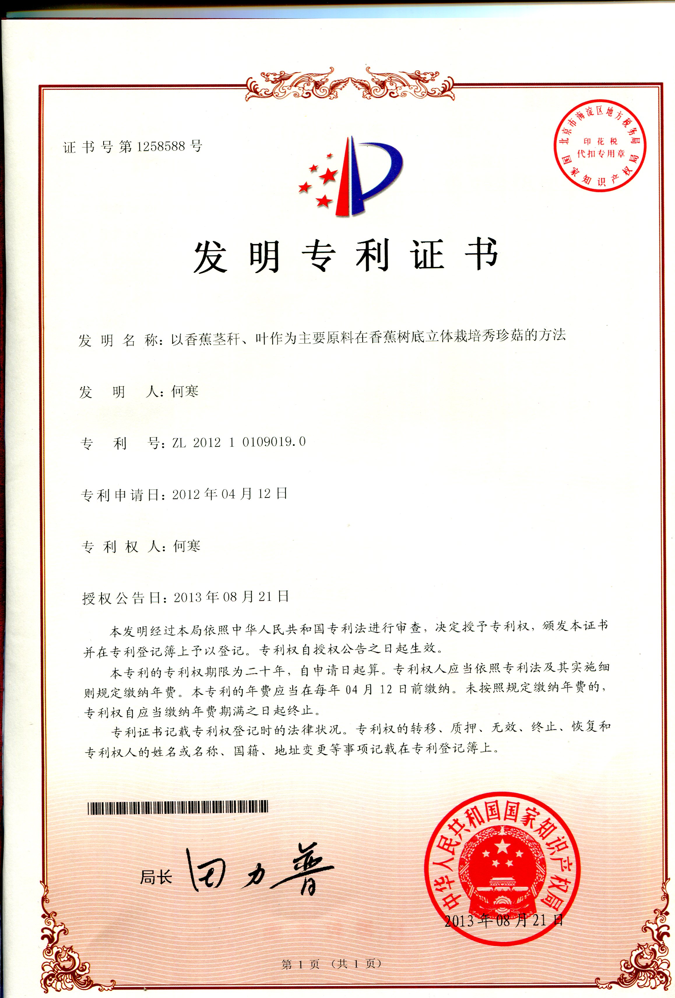 联合创始人何寒的专利